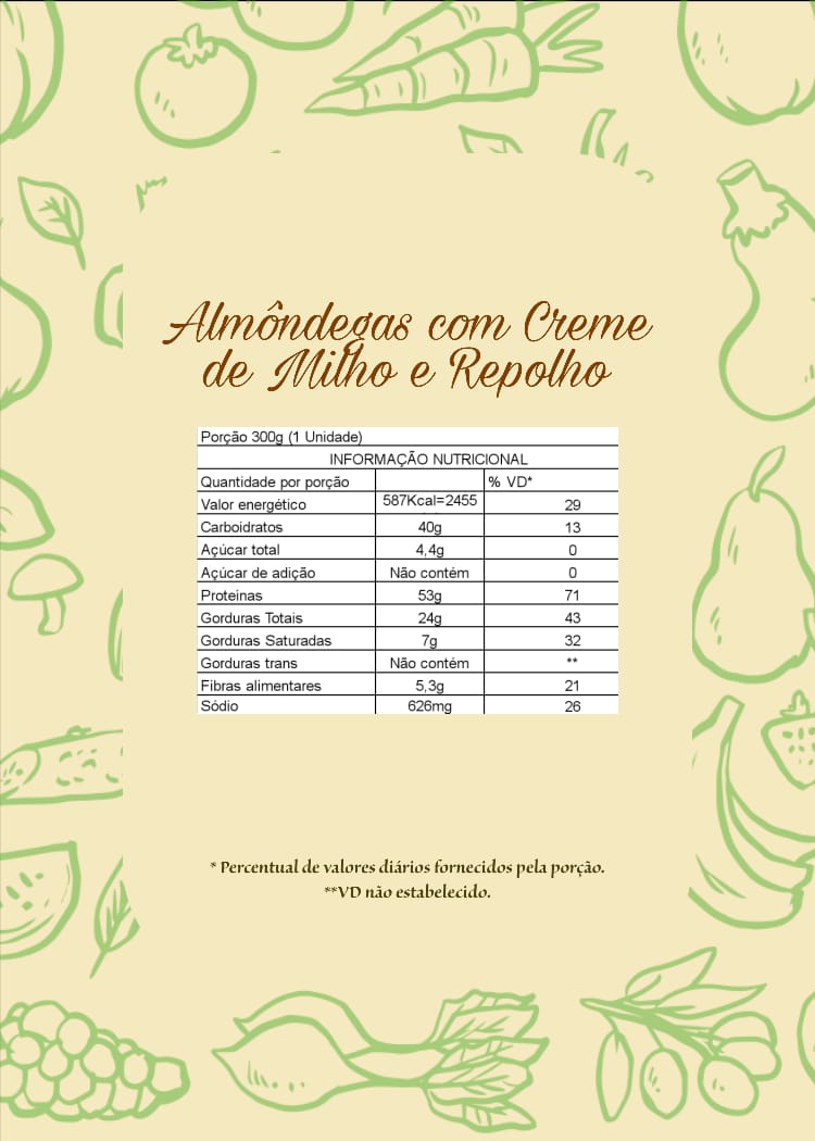 Ingredientes: ovo; patinho bovino; milho verde; inhame; repolho branco; tomate; cebola; alho; farinha de aveia; óleo de girassol; aroma de fumaça; sal; vinagrete; páprica e aromatizante. .