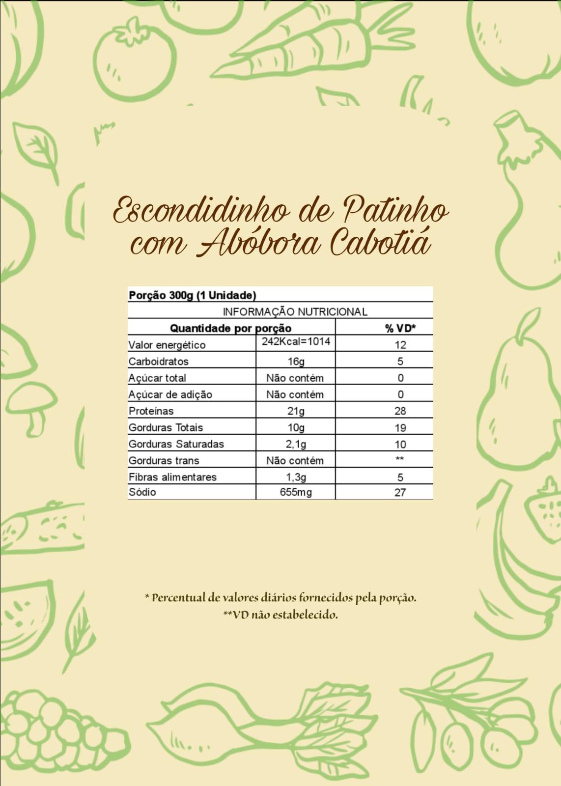 Ingredientes: abóbora cabotiá; patinho bovino; tomate; cebola; manteiga ghee; alho; óleo de girassol; sal; cristal de xilitol (edulcorante natural); cachaça; colorau; vinagrete; orégano desidratado.